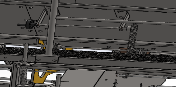 4. 收成單位振動板的寬窄經由過程上面這個扭轉把手來調理。扭轉把手帶著鏈輪,鏈輪經由過程鏈條動員上面的鏈輪,上面的鏈輪經由過程與羅紋塊的間隔的轉變,來調理收成單位的收成巨細,寬窄。